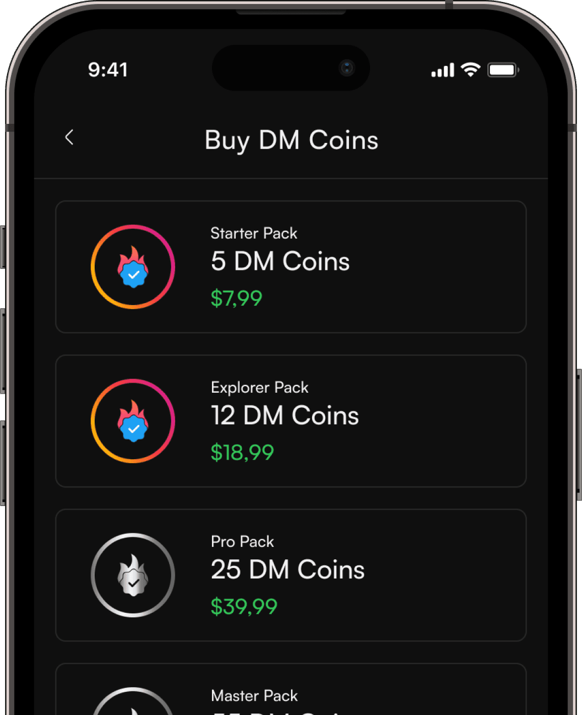 The DM Coin is an in-app currency designed for messaging with creators. It is not a cryptocurrency or related product; rather, it functions as a loyalty point system. Fans can purchase DM Coins to send direct messages to their favorite creators. Creators earn DM Coins from those messages and can instantly convert them to USD.